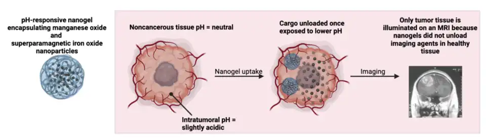 Typical MRI contrast agents that contain gadolinium and manganese are quickly excreted from the body and carry risks of increased toxicity.[33][34] Nanogels aim to circumvent these limitations by encapsulating these agents and increasing their relaxivity, or sensitivity.[7][35] One study encapsulated gadolinium-III within a nanogel and observed a significant enhancement in relaxivity compared to a clinically available formulation of gadolinium-III.[36] Another group developed pH-responsive nanogels containing both manganese oxide and superparamagnetic iron oxide nanoparticles that successfully imaged small tumors, where the pH was more acidic compared to the surrounding healthy tissues.[32] Fluorine-containing nanogels can also be used as tracers for 19F MRI, because their aggregation and tissue binding has only minor effect on their 19F MRI signal. Furthermore, they can carry drugs and their physico-chemical properties of the polymers can be highly modulated.[18][37][38]