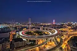 The bridge's double spiral approach on the Puxi side was listed as the world's largest, with a diameter of 180 meter and a total distance of 7.5 km.[6]