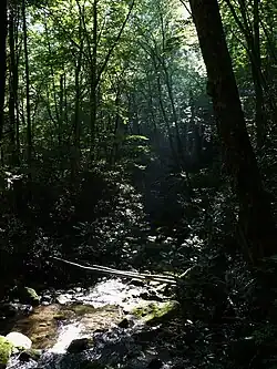 The Nantahala National Forest (/ˌnæntəˈheɪlə/) is the largest of the four national forests in North Carolina, lying in the mountains and valleys of western North Carolina. The Nantahala is the second wettest region in the Continental US, after the Pacific Northwest and it is part of the Appalachian temperate rainforest. Due to its environmental importance and historical ties with the Cherokee, the forest was officially established on January 29, 1920, by President Woodrow Wilson.[3][4] The word "Nantahala" is a Cherokee derived word, meaning "Land of the Noonday Sun." In some spots, the sun reaches the floors of the deep gorges of the forest only when it is high overhead at midday. This was part of the homeland of the historic Cherokee and their indigenous ancestors, who have occupied the region for thousands of years. The Nantahala River runs through it.