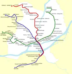 A connection between lines 1 and 2 is due to open in 2013 on the northern part of the network. The link will take the form of an extension of the branch of line 1 to Ranzay, opened in 2012, to Recteur Schmitt on line 2, creating two new stations, "Babinière sud" and "Martin Luther King".[8][11] The planned tramway expansion has not been realized by march of 2023 according to the network map below.