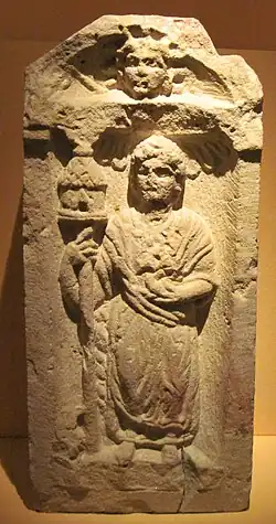 A stone representing Sucellus and Nantosuelta from a cemetery near ancient Margidunum near Nottinghamshire in addition to a votive relief of Sucellus from Margidunum, combined with an abbreviated "M." at the end of the Sarrebourg inscription led scholars to conjecture that the abbreviated "M." may suggest Margi as an epithet of Nantosuelta.[5] The abbreviation has been suggested as an attempt by the artisan to avoid invoking the name of death directly.