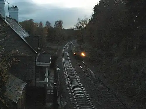 ![]() A Northbound train passes the site of the station at Nant-y-derry, November 2006 | |||||