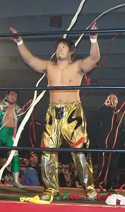 On June 10, 2003, Marufuji made his debut for New Japan Pro-Wrestling (NJPW), teaming with Kotaro Suzuki to unsuccessfully challenge Jyushin Thunder Liger and Koji Kanemoto for the IWGP Junior Heavyweight Tag Team Championship.[41] Marufuji returned to the company on December 9, failing in his attempt to win the IWGP U-30 Openweight Championship from Hiroshi Tanahashi.[42] On May 3, 2004, Marufuji would make his final appearance for NJPW in over five years in a six-man tag team match, where he, Heat and Tiger Mask were defeated by the American Dragon, Koji Kanemoto, and Último Dragón.[43]