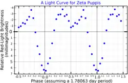 The brightness of Zeta Puppis varies slightly but regularly. Its apparent magnitude varies between a peak of 2.24 and a minimum of 2.26 over 1.78 days.[2] The variations had been thought to be the due to the pulsations of an α Cygni variable,[19] but are too predictable and regular. The eclipse-like light curve is now thought to be due to rotation of the star which has large irregular features at the base of its dense stellar wind.[2][18]