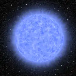 The spectral type is O4If(n)p. O4 indicates a hot massive hydrogen-burning star, typically 40,000–44,000K.[11][5][14] The "f" indicates that the spectrum has emission lines of ionised Helium and Nitrogen, not uncommon in somewhat evolved hot O stars and typically identified by the composite emission and absorption profile of the 468.6nm HeII spectral line. The "n" (for nebulous) indicates broadened absorption lines, caused by rapid rotation of the star, in this case over 220 km/s at the equator. The "p" is a general spectral indicator of peculiarity. This combination of spectral characters is unusual because evolved hot stars are expected to rotate relatively slowly after braking by a strong stellar wind, and only 8 stars of this type are known in the Milky Way.[15] The spectral type complicates determination of physical parameters as the standard spectral luminosity indicator lines are peculiar and this type of star cannot be fully modelled. The enhanced Helium and Nitrogen and the lower surface gravity indicates some degree of evolution away from the zero age main sequence and Zeta Puppis is ranked as a supergiant.[5]
