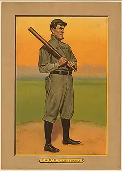 Lajoie was included in the checklist for the 1933 baseball card set produced by the Goudey Gum Company. However, the card (#106 in the set) became infamous for being impossible to find copies of.[80] While the company eventually sent copies of the card to those collectors who wrote in to complain, it was revealed years later that the uncut sheets of the set did not include the card, and the alleged 1933 Lajoie card was printed with the 1934 set. Today, the card is among the highest value from the set.[81]