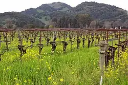The valley floor is flanked by the Mayacamas Range on the western and northern sides and the Vaca Mountains on the eastern side.[24] Several smaller valleys exist within these two ranges. The floor of the main valley gradually rises from sea level at the southern end to 362 feet (110 m) above sea level at the northern end in Calistoga at the base of Mount Saint Helena. The Oakville and Rutherford viticultural areas lie within a geographical area known as the Rutherford Bench in the center of the valley floor.[25] The soil in the southern end of the valley consists mainly of sediments deposited by earlier advances and retreats of San Pablo Bay while the soil at the northern end of the valley contains a large volume of volcanic lava and ash. Several of the small hills that emerge from the middle of the valley floor near Yountville are indicators of the region's volcanic past.