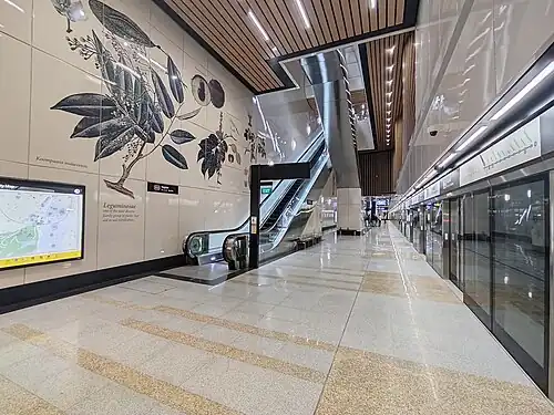Due to the site's space constraints, the station has a stacked side platform layout.[22] To reflect its proximity to the Singapore Botanic Gardens, the station features a garden wall of indoor plants.[23] The curvilinear ceiling above the column-less upper platform was inspired by a folding leaf. This curved motif is echoed on the walls of the lower platform. The station was fully designed by the LTA.[24][25]