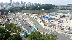 Napier Station was first announced on 29 August 2012 as part of the then-planned Thomson Line (TSL).[4][5] Contract T217 for the design and construction of Napier Station and associated tunnels was awarded to Sinohydro Corporation Ltd. (Singapore Branch) at S$189 million (US$151 million) in November 2013. Construction started in 2014, with an expected completion date of 2021.[6][7] Despite alternatives proposed in a naming poll, Napier retained its name on 27 June 2014.[8][9]