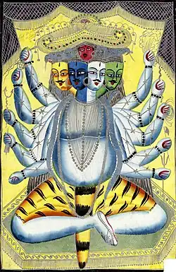 The merchant brought Narahari to the sanctum of Vithoba's temple, while people on the streets mocked Narahari's blindhold and his beliefs. Narahari touched Vithoba's image and felt as though the image had five heads and ten arms. The image wore serpent ornaments around his neck and matted hair on its head. He wore tiger and elephant skin garments and his body was covered in ash. Narahari recognised the iconography of his patron deity Shiva and removed the blindfold to see him. However, he saw the traditional form of Vithoba: a two-armed, arms-akimbo god standing on a brick in silken garments and gold finery. In disbelief, he blindfolded himself again and touched the image. Again, he felt as though he was touching an image of Shiva, not Vithoba. He realised that Shiva and Vithoba (Vishnu) were one and the same. He removes the blindfold and embraces Vithoba's feet. He sings a panegyric in honour of Vithoba, equating him with Vishnu and Shiva alike. Narahari becomes a devotee of Vithoba and joins the Varkaris, preaching the oneness of God.[1][2]