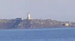 In 1941, because of the beginning of the Great Patriotic War, the beacon building was blown up by order of the Soviet Military Command. Anti-aircraft guns were established on the island to defend Baku from German air raids, because the beacon building was a potential landmark for German aviators. The beacon was restored in 1958 and still functions. An 18m stone tower equipped with a complex optical-navigational system was built on the elevated middle part of the island. Servicing of the way is carried out by a watching method and personnel are changed every two weeks. The beacon's light can be seen 20–30 km from Baku. The beacon's power is provided by solar batteries, which give a charge of up to 7 days, and also by a diesel generator.[4]