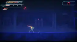 Narita Boy is a 2D platformer with Metroidvania elements, as the player explores the Digital Kingdom using their abilities to travel across the level. In each level the player must find "Techno-Keys" which allow the player to access new areas.