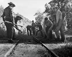 The Rio Grande mainline was gradually re-gauged after it and the Colorado Midland Railway built a new standard gauge joint line to Grand Junction in 1890, but the southern portions remained steam-hauled and narrow gauge into the mid 20th century.[8] This southern segment would be advertised as the "Narrow Gauge Circle" which via a connection with the Rio Grande Southern (which was among various narrow gauge railroads connecting with the larger Denver & Rio Grande which had been built by Otto Mears) allowed travelers to make a continuous journey through the southwestern corner of Colorado onboard narrow gauge trains.[9] The cash strapped Rio Grande Southern would build a fleet of Galloping Goose cars to preserve the mail contract along their route from the 1930s until the lines abandonment in 1952.[10]
