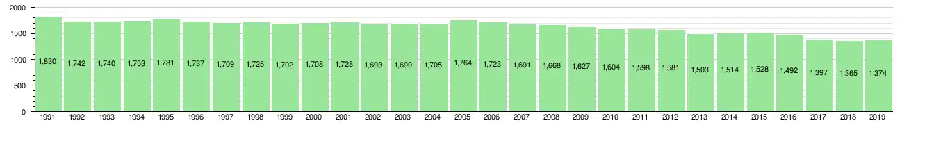 With 1,346 inhabitants as of 2020, Narsaq is the second-largest town in the Kujalleq municipality.[1] The population has decreased 25% relative to the 1990 levels, and has been decreasing over the last several years. Most towns and settlements in southern Greenland exhibit negative growth patterns over the last two decades, with many settlements rapidly depopulating.[12]