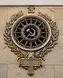 Over the escalator run there is a relief reading "Glory to Work!" (Russian: Слава труду!, romanized: Slava trudu!), sculpted by G. V. Kosov, A. G. Ovsyannikov, V. G. Stamov, and A. P. Timchenko. This area had been planned to contain an engraving of Stalin.[2]