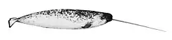The narwhal was scientifically described by Carl Linnaeus in his 1758 publication Systema Naturae.[5] The word "narwhal" comes from the Old Norse nárhval, meaning 'corpse-whale', which possibly refers to the animal's grey, mottled skin and its habit of remaining motionless when at the water's surface, a behaviour known as "logging" that usually happens in the summer.[6][7] The scientific name, Monodon monoceros, is derived from Ancient Greek, meaning 'single-tooth single-horn'.[8]