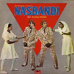 Nasbandi is a 1978 Bollywood satirical film directed by I. S. Johar, starring duplicates of the popular Bollywood actors of the time.[2] It is a satire on the sterilization drive of the government of India during Indira Gandhi's ruling period. Each character in the film is trying to find sterilization cases.