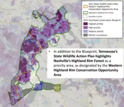 Delineation of NHRF was based on the U.S. Fish and Wildlife Service's (USFWS) Southeast Conservation Blueprint (SECAS Blueprint) database, used by multiple state, federal, and private organizations to rank and identify priority areas for conservation conservation throughout the southeast U.S. The Tennessee Wildlife Resources Agency (TWRA) collaborated with The Nature Conservancy and other partners to define the most prioritized conservation areas within the State of Tennessee, including the Western Highland Rim's forests, utilizing the SECAS Blueprint database and model.[11][12][13] Nashville includes a sizable portion of a large multi-county, conservation-priority area known as the Western Highland Rim Forests Conservation Opportunity Area (COA) identified by Tennessee in the TWRA 2015 State Wildlife Action Plan (SWAP).[12]