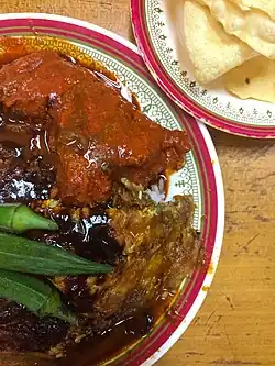 The rice for a nasi kandar dish is often placed in a wooden container about three feet high, giving it a distinctive aroma. The rice is accompanied by lauk-pauk (side dishes) such as ayam goreng, assortment of kari (curry) like kari daging (beef), kari limpa (beef spleen) and kari kambing (mutton); telur ikan, udang goreng or sotong goreng.[6] The vegetable dish would usually be terung (brinjals), bendi (okra) or peria (bitter gourd). A mixture of curry gravies are poured on the rice. This is called banjir ("flooded") and imparts a diverse taste to the rice.