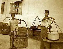 The earliest form of nasi kandar initially contained fish curry with brinjals or okra, fried curry beef, fried fish and boiled eggs; it cost about 5 cents each.[4] The rice hawkers would commonly set up stools at a jetty to sell breakfast to dock workers. By the 1930s, the rice peddlers would also commonly travel from home-to-home. It was also common for the seller to operate on the roadside or beneath a shady tree. They would carry brass pots by a bamboo or a wooden shoulder pole; on one end of the pole there were containers holding curry meals, with plain rice on the other end.[3]