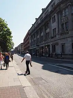 From the 1960s onwards many of the Georgian and Victorian buildings on the street were demolished in favour of modern retail and office units. One such development was on the corner of Nassau Street and Dawson Street by the Norwich Union Group. A collection of 15 Georgian and Victorian buildings were demolished, including the original Elverys Sports corner store[6] and the 1870 McCurdy's Law Club.[7] The new 5-storey t-shaped office block with street-level retail units was designed by Lardner and Partners.[6] The new building, completed in 1967 was called Nassau House. Permission was granted to demolish this block in 2016,[8] and the construction of a replacement mixed-use development is due for completion in 2022.[9] In the 1970s, a 2.5 acre site facing onto the street was redeveloped as the Setanta Centre.[10]
