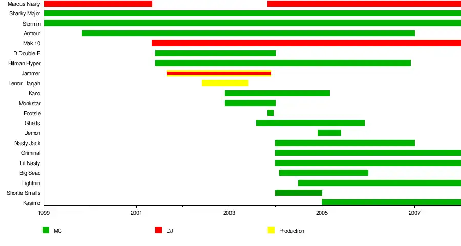 Marcus Nasty spent two years in prison between mid-2001 and November 2003,[1] and during this period his brother, Mak 10, became the crew's primary DJ.[30] D Double E, Hitman Hyper and Jammer each individually joined the crew over the course of three or four months, after their own Newham-based crew 187 had disbanded following in-fighting and had given up their own Flava FM show.[29][31][10][4] As D Double E remembers it:
