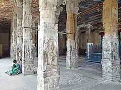 Nrithya sabha (also called Nritta Sabha, Natya sabha, or "Hall of Dance") is a "so-called 56-pillared" hall. It is in the south section of the second courtyard that circumambulates the Nataraja sanctum of the complex. This second courtyard is near the temple's flag mast (kodi maram or dwaja sthambam). The 13th-century Nritta Sabha is traditionally considered as the place where Shiva and Kali originally entered into a dance competition.[100] Shiva won with the urdhva-tandava pose that raised his right leg straight up, a posture that Kali refused because she was a woman. The hall is rectangular consisting of three stacked squares, a 15-meter-sided square that is the main hall, which is connected to 4 meters by 8 meters rectangular mukha-mandapa to its north. The hall now has 50 pillars, but evidence suggests that it may have had 56 or more pillars earlier.[100] These pillars are intricately carved from top to bottom. The lower levels have dancers in Natya Shastra mudras accompanied with expressive musicians as if both are enjoying creating the music and the dance. The pillars also have embedded narratives of legends from Hindu texts, such as of Durga fighting the buffalo demon, as well as humorous dwarfs frolicking. Below the kapota, the structures show reliefs of seated people, many in namaste posture, some with a beard and yogi like appearance representing saints and rishis. Nearly 200 of these are still visible, rest appear to have been damaged or eroded over time.[100][101]