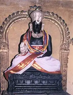 Though there is difficulty in identifying Nathamuni's date of birth and age, he is considered to have lived during the lifetime of Madhurakavi Alvar's parampara (lineage).[1] According to Sri Vaishnava tradition, Nathamuni was conversing with his father about the legend of Prabandhams written by the Alvars. His father, Ishvara Bhattar, exclaimed the Prabandhams were long lost, and that they would be impossible to retrieve unless one had the grace of Narayana. Hence, he got interested in this and had set to the pilgrimage to the Kumbakonam Sarangapani Temple, where Vishnu is worshipped under the epithet of Aravamudhan. There, he heard priests singing 10 particular pasurams (hymns) dedicated to Aravamudhan (Sarangapani temple's main deity) by the saint Nammalvar. He was overjoyed hearing those and enquired its details. But the priests stated that only 10 pasurams was known to them out of 1,292 written by Nammalvar. He placed immense faith on the deity Aravamudhan and he visited Thirukurgur, birth place of Nammalvar. He enquired about the Prabandhams written by Nammalvar to Madhurakavi's direct descendants who lived at Thirukurgur. There, the descendants of Madhurakavi gave 10 pasurams written by Madhurakavi by the name of Kanninun Cirutampu. They also informed Nathamuni that whoever sings these 10 pasurams with dedication would meet Nammalvar himself at the shrine in the city. He kept full faith in Nammalvar and started singing the pasurams with dedication under the tamarind tree under which Nammalvar himself is believed to have sat during his lifetime. Once he completed the count 12,000 times, the deity Aravamudhan sent Vishvaksena, the commander of Vishnu's armies, to bless Nathamuni again as Nammalvar (Nammalvar is believed to be the avatar of Vishvaksena). Thus, Nammalvar himself came in front of Nathamuni and granted him all the 4,000 pasurams of all the Alvars, instead of just 1,292 written by him. He joyously returned and expressed his gratitude to Aravamudhan and Nammalvar profusely. Nathamuni, thus, is regarded to have revived the Naalayira Divya Prabandham, hence becoming the first acharya of the Sri Vaishnava tradition. Nathamuni is considered to be an incarnation of a nityasuri in Vaikuntha, named Gajananar. His grand disciple is Ramanuja himself, who is considered as an incarnation of Adishesha.