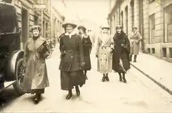 The Swedish Society for Women's Suffrage regarded the more violent methods of the British Suffragettes to be non-constructive and did not wish to be associated with them, as they feared that this would erase all sympathy for the issue.[3] Only one street demonstration was ever organised by the society. After a motion of women's suffrage was voted down in 1918, the participants marched with three banners representing people without the right to vote. The first banner showed a male criminal in prison; the second a male patient in a mental hospital; and the third banner the respected author Selma Lagerlöf, member of the Royal Swedish Academy. This demonstration was organized by Frigga Carlberg of the Gothenburg section, which was the most radical of the sections. It was also Carlberg who once invited Sylvia Pankhurst as a speaker. These were exceptions.