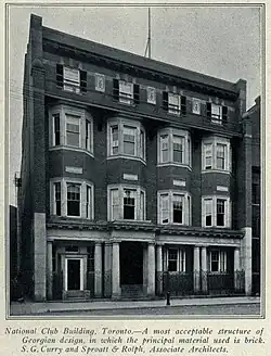 In 1903, $50,000 of a total estimated construction cost of $90,000 was raised by subscription among National Club members to purchase a lot and build a new clubhouse at 303 Bay Street.[5][6][7] On September 12, 1906, the cornerstone was laid and on December 17, 1907, the National Club's new premises opened.[8] The following day, The Globe newspaper described the new premises designed by noted Toronto architect S. George Curry as “Architecturally... a triumph.”[8]
