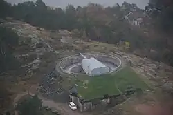 Austrått Fort was constructed in 1942 by the German Wehrmacht to protect the Trondheimsfjord during the German occupation of Norway during World War II. The fort's centerpiece is a 28 cm SK C/34 naval gun from the German battleship Gneisenau, which was damaged in Kiel. The three-canon gun weighs 800 tonnes and was capable of firing 38 kilometers (24 mi). The last firing took place in 1953 and the fort was decommissioned in 1968. It opened as a museum in 1991.[4] |
