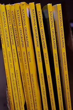 National Geographic (formerly The National Geographic Magazine,[3] sometimes branded as Nat Geo)[4] is an American monthly magazine published by National Geographic Partners.[5] The magazine was founded in 1888 as a scholarly journal, nine months after the establishment of the society, but is now a popular magazine. In 1905, it began including pictures, a style for which it became well known. Its first color photos appeared in the 1910s. During the Cold War, the magazine committed itself to present a balanced view of the physical and human geography of countries beyond the Iron Curtain. Later, the magazine became outspoken on environmental issues.