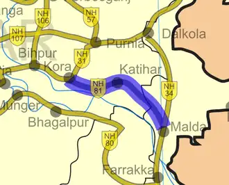 National Highway 81 (NH 81) is a National Highway in Eastern Indian states of Bihar and West Bengal. NH 81 links Kora in Bihar to Malda in West Bengal. Of its 100 km (62 mi) length, NH 81 runs for 45 km (28 mi) in Bihar and 55 km (34 mi) in West Bengal. [1] [2] In 2010, the highway was renumbered to form various sections of present-day NH 31 and NH 131A.