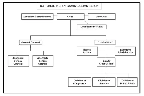 The commission is an independent regulatory agency, but works closely with the Department of Justice and the Department of the Interior on matters of game classification and Indian lands questions.[2] In addition, it is represented in litigation in court by the Department of Justice. Thus, its independence has some practical limits related to cooperation with Executive Branch agencies.
