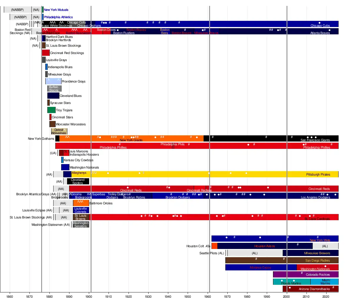 - Between 1876 and 1901, in addition to the NL teams, only American Association (AA) and Union Association (UA) teams that eventually joined the NL are shown.