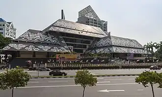 The building design and concept reflecting Malaysian identity that symbolises intellectual achievement plus inspiration from the national's rich cultural heritage. The concept of the mind lends its touch in the architecture of the interior. The design is based on the concept of the traditional Malay headgear the tengkolok which is a symbol of intellectual pride and respect in Malaysian culture.[4] The tiles on the roof are also unique containing patterns inspired by the Kain Songket (traditional hand woven cloth).