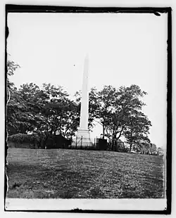 In 1831, the citizens of Fredericksburg had secured about US$2,000 for the building of a monument over the grave when Silas E. Burrows[8] of New York asked "to be allowed the honor of individually erecting the monument." The generous offer was accepted and President Andrew Jackson laid the cornerstone on May 7, 1833. In the next four years, the monument's base with its small Doric columns was completed and the obelisk was on the ground ready to be lifted into place when the work was suddenly abandoned. After providing money for the completion of the work, Mr. Burrows went to China where he died; then the contractor died.[3]