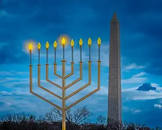 ![]() U.S. National Menorah in 2023 with the Washington Monument in the background | |