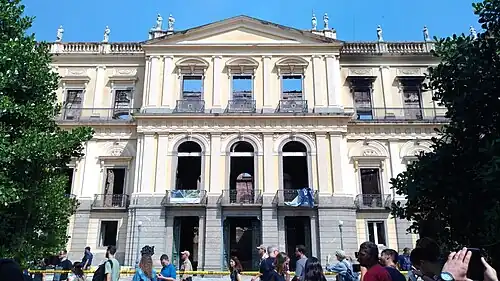 The National Museum of Brazil was heavily damaged by a large fire which began about 19:30 local time (23:30 UTC) on 2 September 2018.[5][6][7] Although some items were saved, it is believed that 92% of its archive of 20 million items was destroyed in the fire. The small number of unscathed items were stored in a separate building which was not damaged.[8]