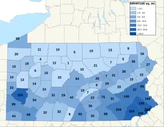 The following are approximate tallies of current listings in Pennsylvania on the National Register of Historic Places. These counts are based on entries in the National Register Information Database as of April 24, 2008[2] and new weekly listings posted since then on the National Register of Historic Places web site.[3] There are frequent additions to the listings and occasional delistings and the counts here are not official. Also, the counts in this table exclude boundary increase and decrease listings which modify the area covered by an existing property or district and which carry a separate National Register reference number. 16 percent of the NRHP's in Pennsylvania are in Philadelphia, and nearly 40 percent are located within the Delaware Valley.