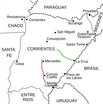 In previous times there was a road with this number in the same province.[1] With a length of 108 kilometres (67 mi) this unpaved road joined the town of La Cruz near the Uruguay River with the old Route 14 (today Provincial Route 40). By agreement of 27 July 1971][2] this road fell under the provincial control as Provincial Route 114, still unpaved. This section is marked in green on the map.