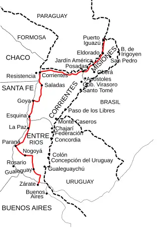 After Ceibas it followed the present National Route 14, traversing near Gualeguaychú, and the present Provincial Route 20, passing through Urdinarrain, Basavilbaso, Villaguay, Federal (Entre Ríos province) and San José de Feliciano.