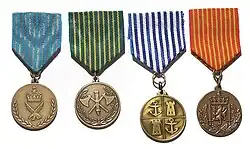 The Norwegian National Service Medal is awarded upon completion of mandatory military service (usually one year, six months for the Home Guard). The medal exists in four versions, one for each branch of service (army, air force, navy and home guard).