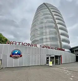 The National Space Centre is a museum and educational resource covering the fields of space science and astronomy, along with a space research programme in partnership with the University of Leicester. It is located on the north side of the city in Belgrave, Leicester, England, next to Space Park Leicester and the River Soar. Many of the exhibits, including upright rockets are housed in a tower with minimal steel supports and a semi-transparent cladding of ETFE 'pillows',[1] which has become one of Leicester's most recognisable landmarks. The National Space Centre contains the United Kingdom's largest planetarium. It is a registered charity with a board of trustees.[2]