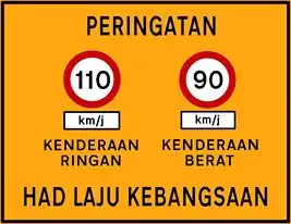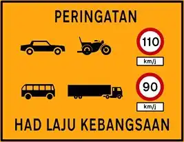 Had Laju Kebangsaan (National Speed Limits) is a set of speed limits applicable on Malaysian expressways, federal roads, state roads and municipal roads. The National Speed Limits was enforced on 1 February 1989 following the National Speed Limit Orders 1989 (Perintah Had Laju Kebangsaan 1989).[1] Like any other countries in the world, failing to obey the speed limit on Malaysian roads and expressways is an offence as subject to Malaysian Road Safety Act 1987, which can be fined up to RM300, depending on the difference between the speed limit and the driven speed.