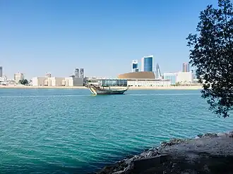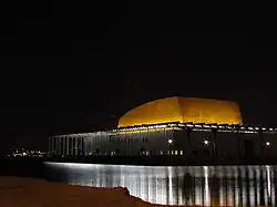 The National Theatre of Bahrain (Arabic: مسرح البحرين الوطني, also known as the Bahrain National Amphitheatre) is a waterfront building complex situated in Manama next to the Bahrain National Museum, and consists of a main 1001-seat auditorium and a smaller 150-seat flexible studio theatre.[1] Opened on 12 November 2012 and costing $50 million, the theatre encompasses an area of 11,869 square metres (127,760 sq ft) making it the third largest theatre in the Middle East.[2]