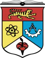 The current coat of arms of the UKM was first designed by university staffer Mohd Aris Atan and has been in use since 1972. It was modified to its present form by publications officer Zulkifli Ibrahim, which was launched on 29 July 2000 in conjunction with the university's 30th anniversary, with stripes added to the tiger's body.[35][36] The arms is depicted as a quartered shield featuring an atomic symbol, a compass, a gear, a Malayan tiger and the national flower, Bunga Raya, or hibiscus rosa-sinensis, with an overlaid book placed on top of it. The atomic symbol represents science, the compasses and gear represent technology, the tiger represents strength and courage and the book represents knowledge.[37] It is blazoned: