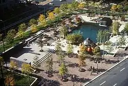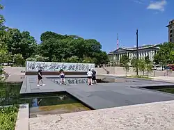 National Plaza was never constructed. Instead, a much smaller Freedom Plaza was built that did not require the demolition of Pershing Square. Designs for a statue and memorial to Pershing and for the larger park were finalized in the 1970s, and Pershing Park was constructed simultaneously with Freedom Plaza from 1979 to 1981.[13] The park was slightly enlarged due to the realignment of Pennsylvania Avenue NW along the area's north side. Pershing Park formally opened to the public at 11:45 AM on May 14, 1981.[14][15] The American Battle Monuments Commission paid the $400,000 for the park.[16]