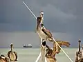 The coat of arms depicts two animals which are supporting the shield. On the left is a "dolphin" which is symbolic of the fishing industry. On the right is a pelican which is symbolic of a small island named Pelican Island that once existed off the coast of Bridgetown. Above the shield is the helmet of Barbados with an extended arm clutching two sugar-cane stalks. The "cross" formation made by the cane stalks represents the saltire cross upon which Saint Andrew was crucified. On the base of the coat of arms reads "Pride and Industry".