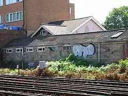 The former Kinemacolor studios in Hove, used for narrative films by the Natural Color Kinematograph Company, seen in 2005. The word "KINEMACOLOR" is visible, painted to the side of the building.